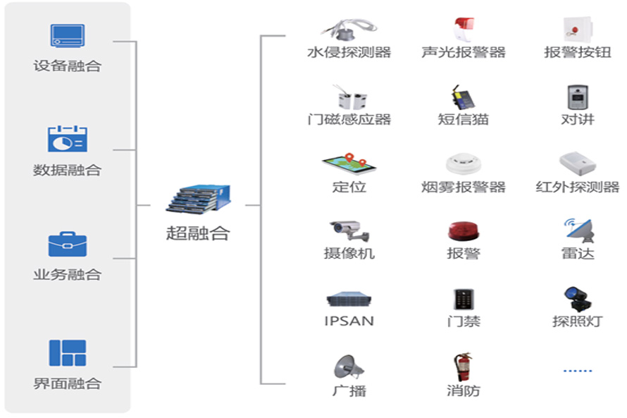 超融合智能终端对差异化、多种类的感知设备进行信息采集,实现标准化接口输出,解决繁琐的设备接入问题。设备接入的种类包括视频设备、音频设备、报警设备、门禁设备、对讲设备、广播设备等。到目前为止,已兼容主流视频监控五十多款;兼容主流门禁设备二十几款;兼容报警设备十几款。
